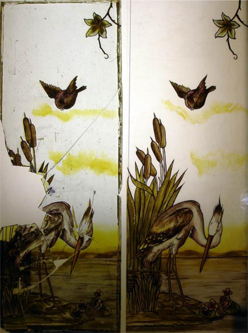 Repair and restoration of Daniel Cottier stained glass door and side panels Glasgow, West End.
